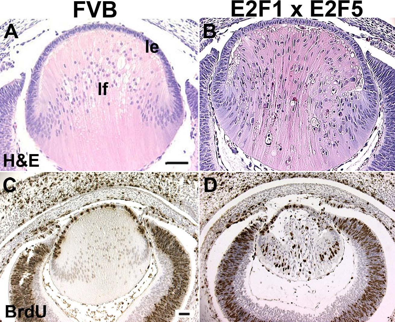 Figure 3. Characterization of E2F1/E2F5 bigenic eyes at E14.5. When compared with FVB lens (