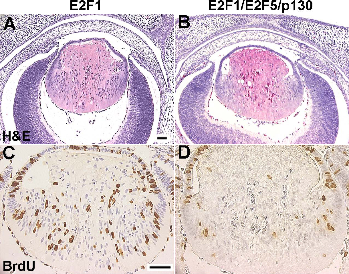 Figure 8. E2F1/E2F5/p130 triple transgenic lens histology and BrdU incorporation assays. A-B: At E15.5, the E2F1 single (A) and E2F1/E2F5/p130 triple transgenic lenses (B) showed similar defects in fiber cell elongation, plus the presence of extra condensed nuclei in the center of the lenses.