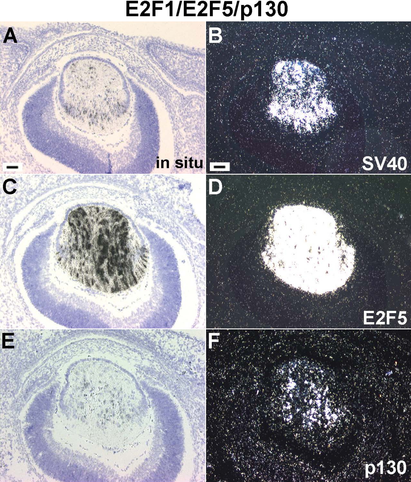 and p130 transgenes using SV40 (for E2F1), human E2F5 and mouse p130 riboprobes. Bright-field (A, C, E) and dark-field (B, D, F) images are shown. The transgenes were expressed specifically in lens fiber cells. Transcription signals of p130 (F) were much weaker than the E2F1 (B) and E2F5 (D) transgenes. Scale bars=500 μm.
