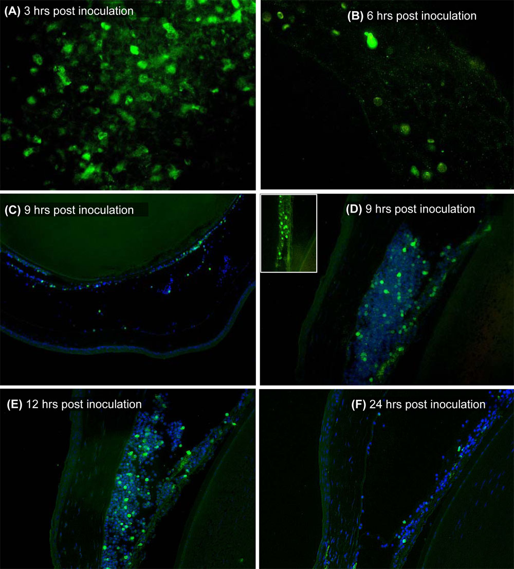 images demonstrate a reduced presence of eGFP(+) observed in the central anterior chamber (AC) from 3 h (A) to 6 h (B) post inoculation. Representative low-magnification images demonstrate the few eGFP(+) cells observed in the central AC at