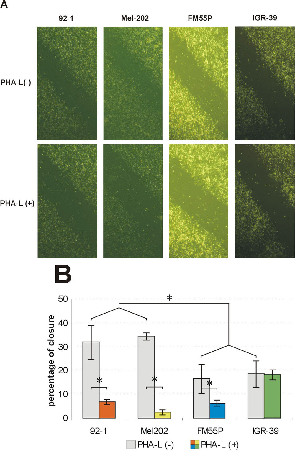 25 μg/ml phaseolus vulgaris agglutinin (PHA-L) in serum-containing RPMI 1640. A: Panels show migration of cells in the presence or absence of PHAL after 24 h. B: The extent of wound closure was quantified by measurements of the width of the wound space for each case. For this value,