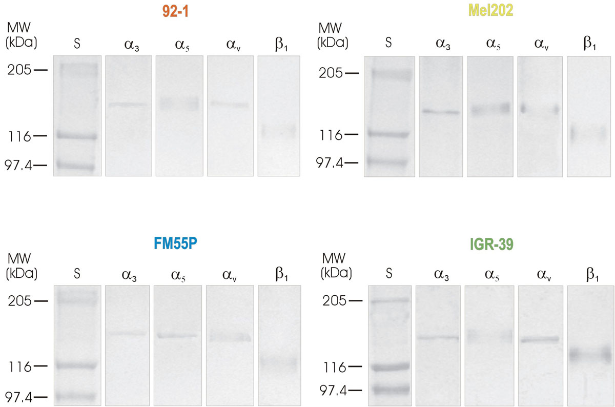 Figure 5. Immunodetection of α3, α5, αv, and β1 in materials obtained after precipitation of 92–1, Mel202, FM55P, and IGR-39 cell extracts with phaseolus vulgaris agglutinin