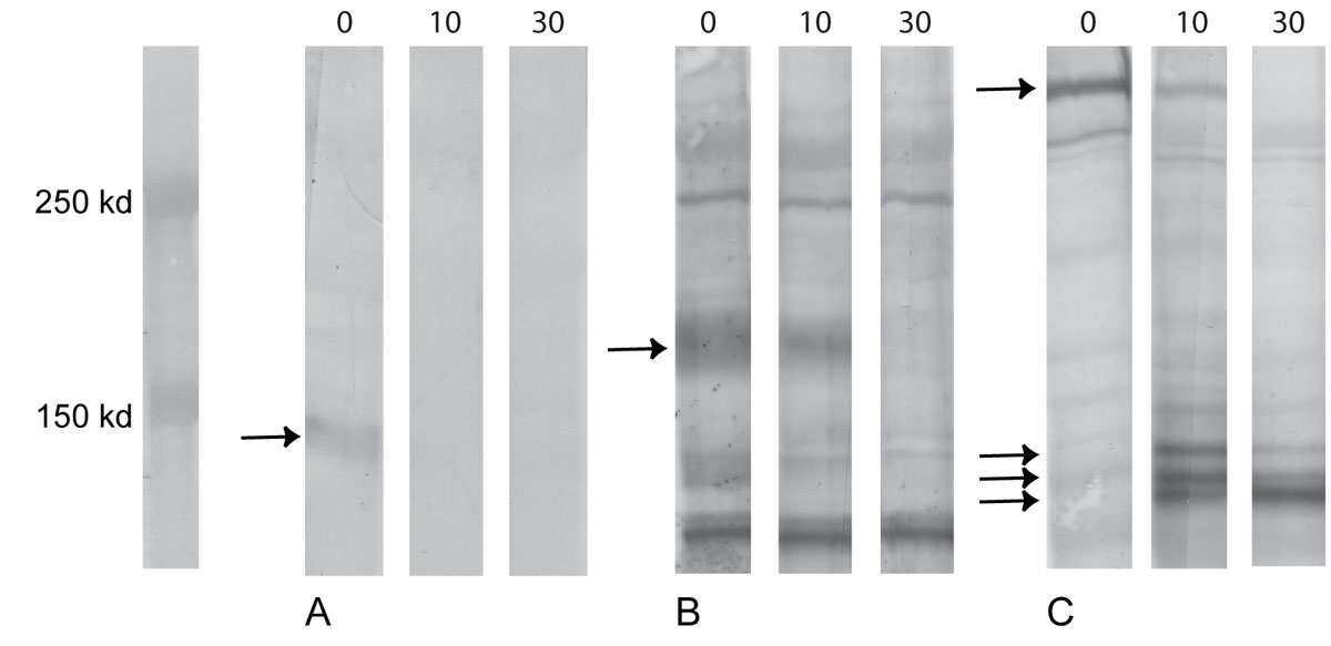 and the appearance of breakdown products at 130, 135, and 140 kDa. Specific bands are indicated with arrows.