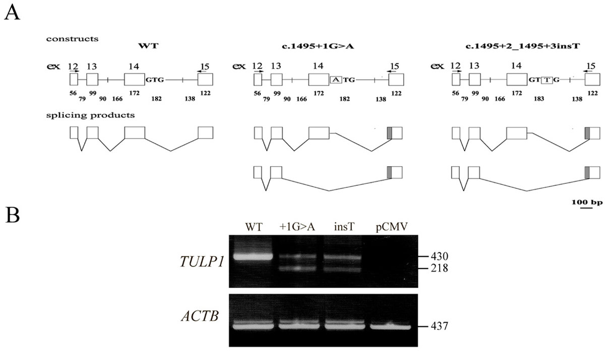 Figure 4. Minigene constructs and products obtained in the in vitro splicing assay. A: Shown is a schematic representation of the constructs, which include TULP1 exons 12 to 15 (represented by boxes), flanked by 79–183 bp of intronic sequences (represented by straight lines). Constructs