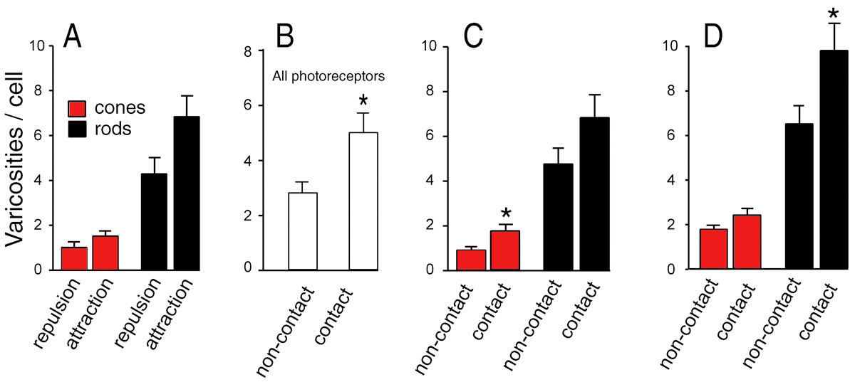 if contact was made with the target cell (asterisk denotes p<0.05, Mann–Whitney test; the n’s are the same as above). D: For rod cells, but not cones, the number of varicosities was significantly increased with contact when only those cells that