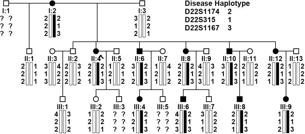 three microsatellite markers on chromosome 22q11.2–12.1, which is listed in descending order from the centromere. Squares