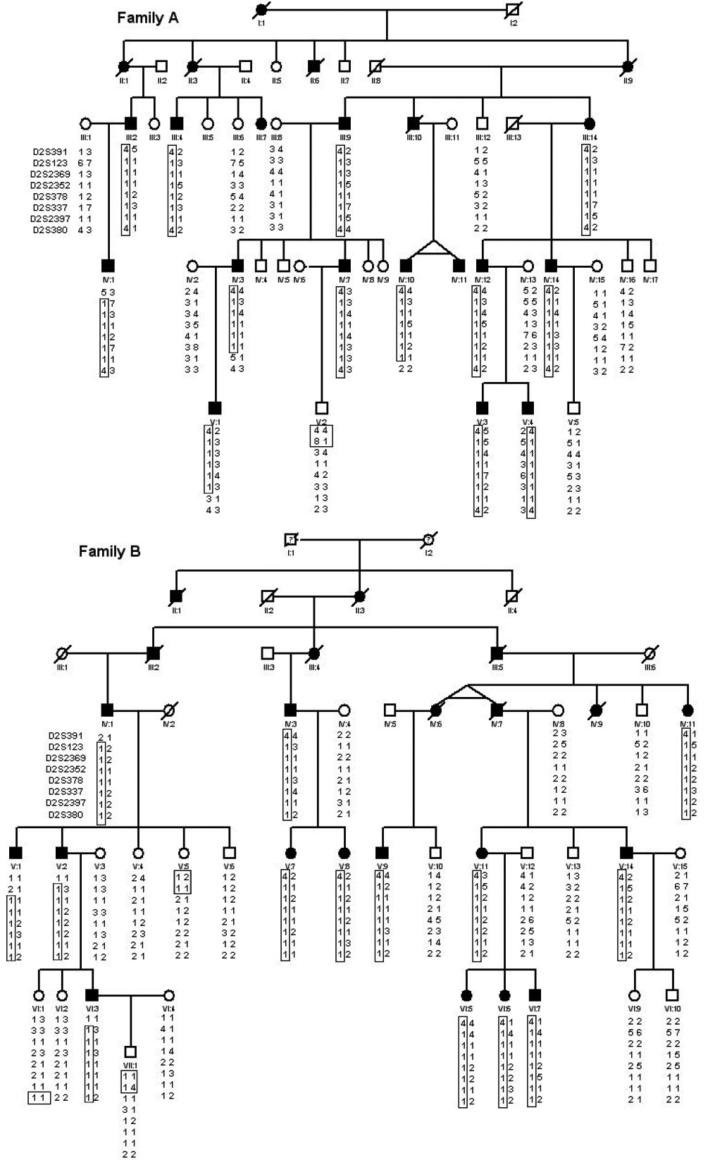 tandem repeat markers from the2p12-p16 region. The square symbol indicates male; the circle symbol denotes female; the filled