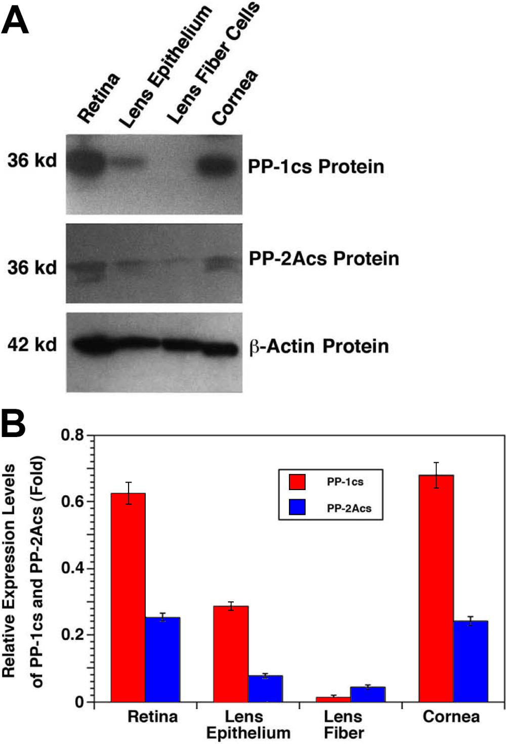 Figure 3. Western blot analysis of the protein for the catalytic subunits of PP-1 (PP-1cs) and PP-2A (PP-2Acs) in the retina, lens epithelium,