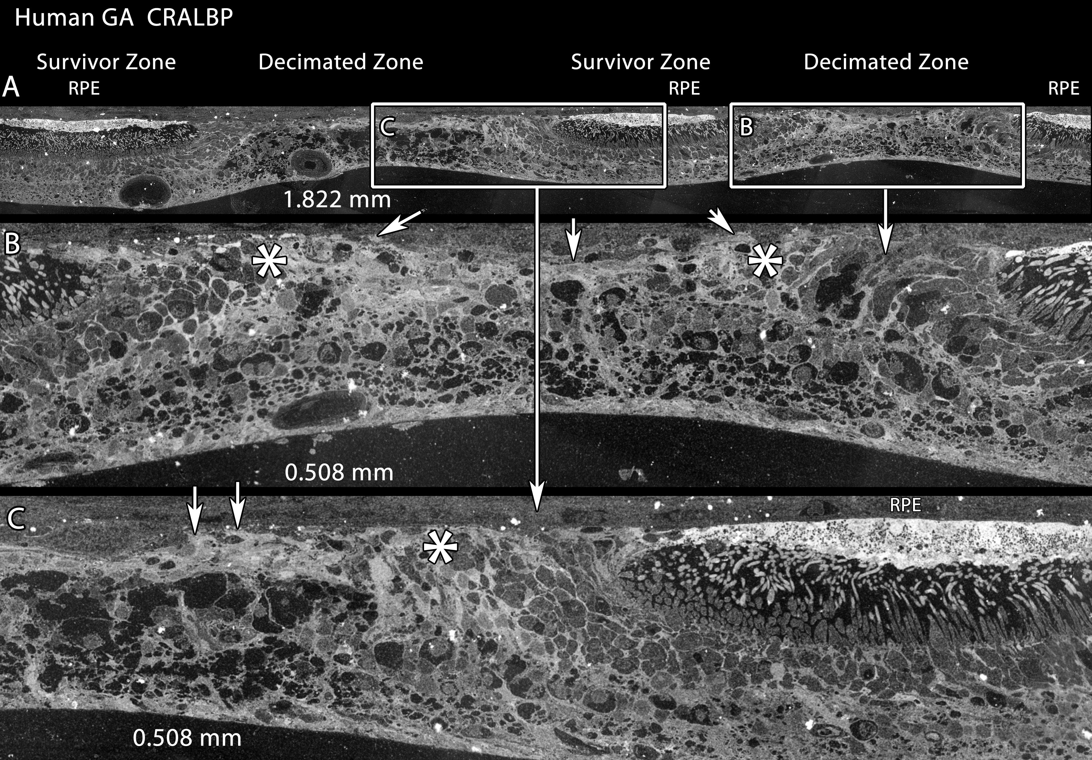 the uneven choroid-retina interface. Asters indicate the sharp survivor-decimated retina border. A: CRALBP signals displays three patches of retinal pigment epithelium (RPE) over survivor zones, with decimated retina between.