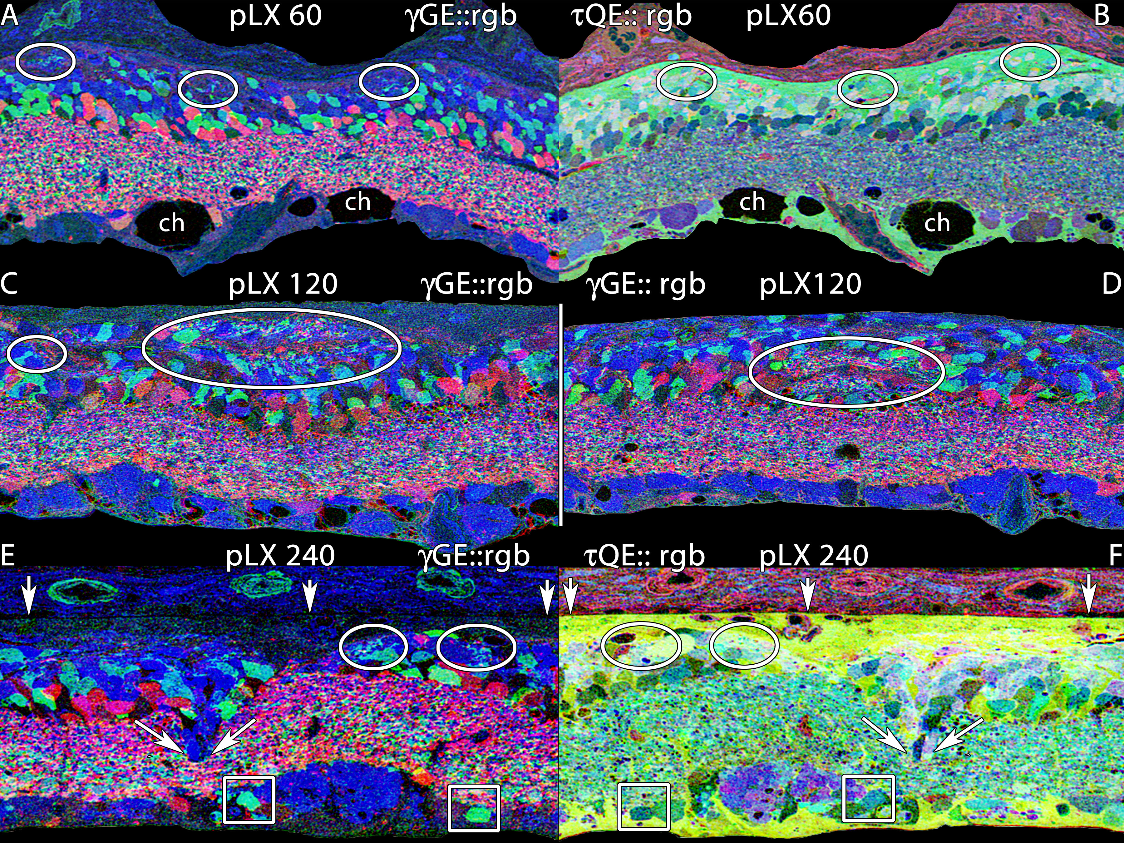 panel is 0.256 mm wide.B: τQE::rgb mapping shows that the microneuromas are embedded in the distal seal region far from the inner plexiform layer.C, D: γGE::rgb mapping at pLX 120 displays larger microneuromas above (C) and within (D) the inner nuclear layer. Each panel is 0.256 mm wide.E. γGE::rgb mapping at pLX 240 reveals small microneuromas flanking