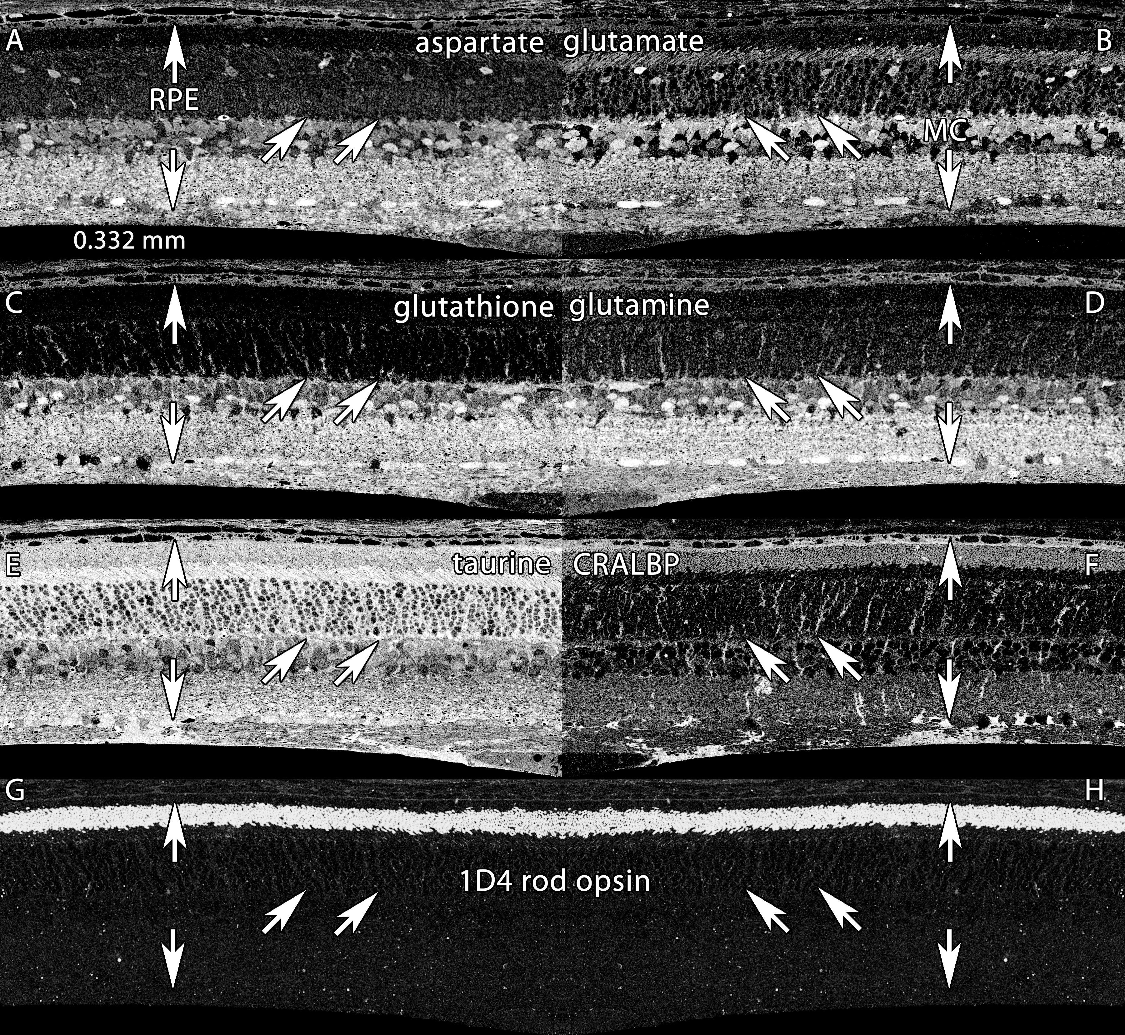 oblique arrows mark the border of the outer nuclear and outer plexiform layers. Panels are 0.332 mm wide. A: Aspartate is high in the RPE, in cone photoreceptors and various neurons of the neural retina but low in rods. B: Glutamate levels are high in neurons and lower in MC. C: Glutathione levels are high in the RPE and MCs, but very low in photoreceptors. D: Glutamine is high in all cells, but especially MCs. E: Taurine is high in the RPE, photoreceptors and MCs, and somewhat lower in neurons. F: cytosolic retinal binding protein (CRALBP) is expressed throughout MCs and the RPE, with significant levels in the outer