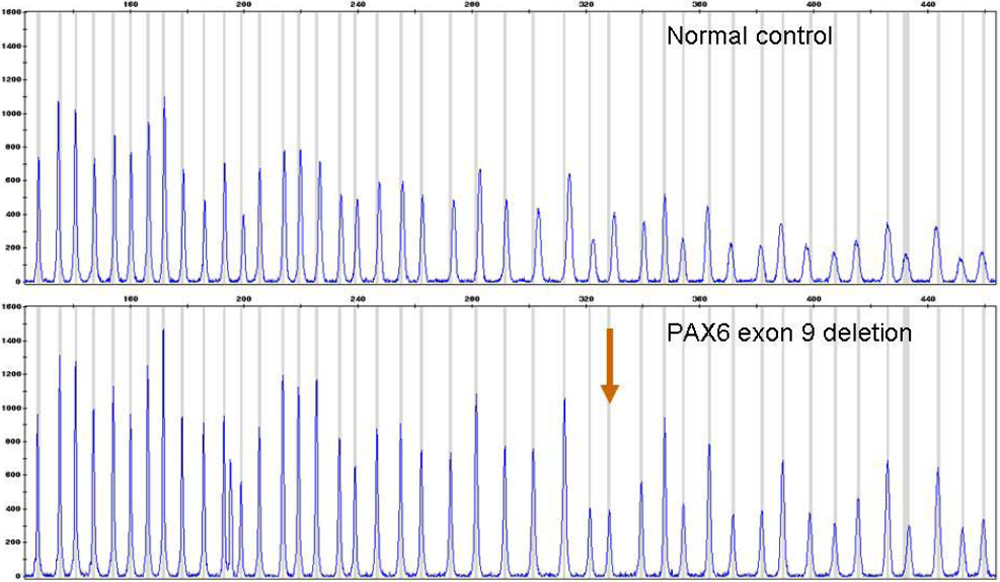 exon 9 deletion by MLPA. Electropherograms are from a normal control and from the patient with an exon 9 deletion. The deletion is apparent by a ~50% reduction in peak area of the