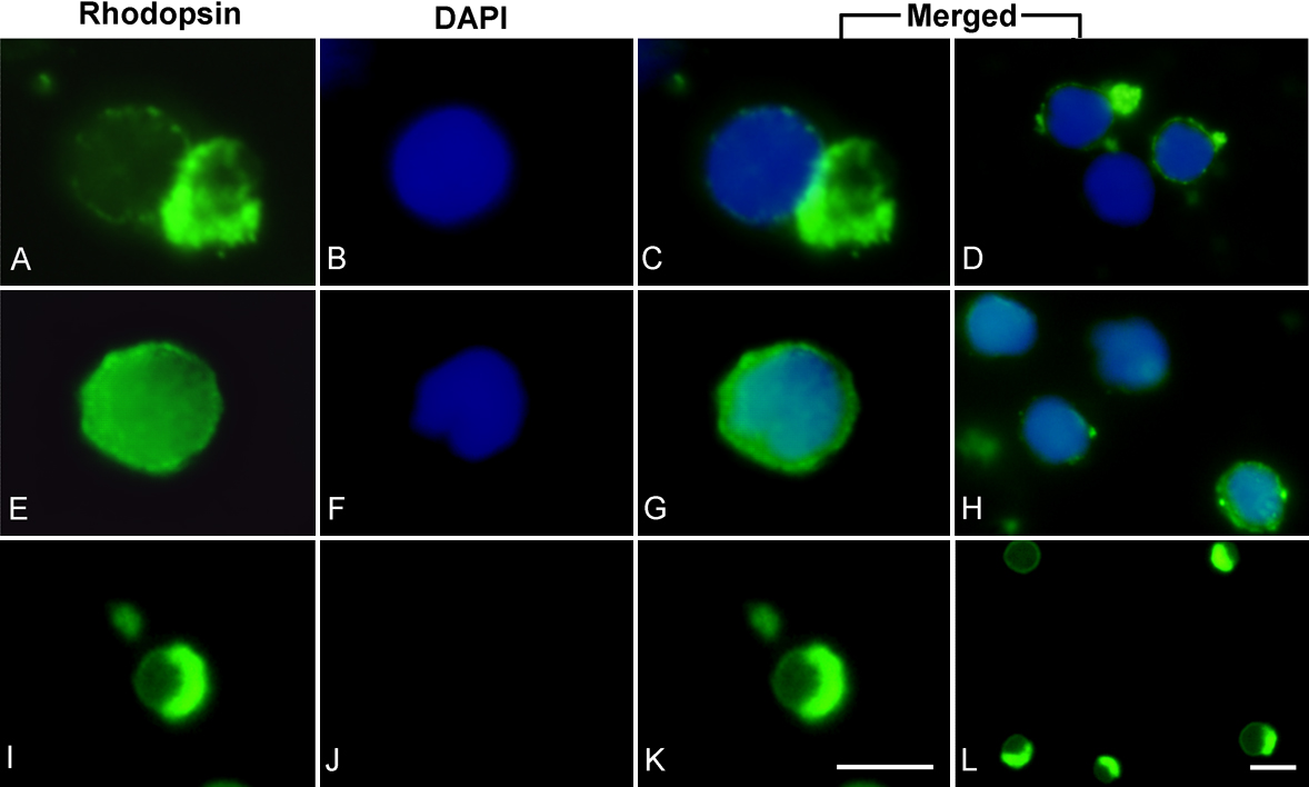 rhodopsin was mostly expressed within the cytoplasm of the cells. I-L: