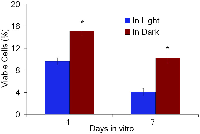 of cells that remain viable was significantly higher in experiments performed in dark-adapted conditions (the asterisk indicates