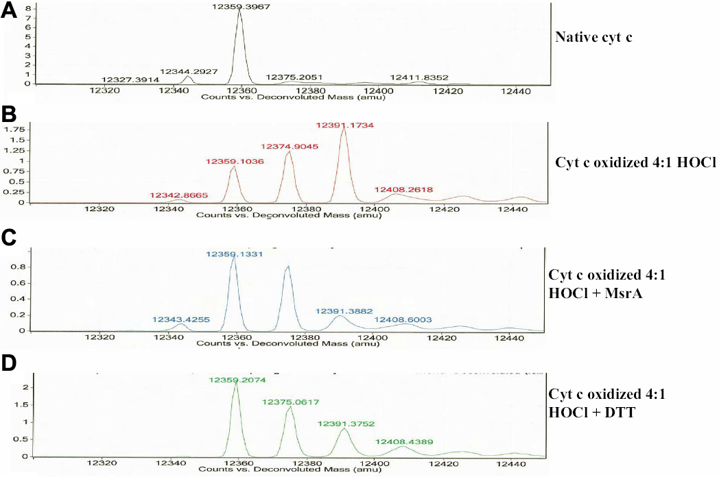 Figure 6. Deconvoluted ESI mass spectra of HOCl-oxidized cytochrome c. A: Native cytochrome c. B: Cyt c oxidized (4:1 Cyt c: HOCl for 15 min). C: Cyt c oxidized (4:1 Cyt c: HOCl for 15 min) and repaired by 1.9 μM MsrA (2 h at 37 ºC) and 15 mM DTT. D: Cyt c oxidized (4:1 Cyt c: HOCl for 15 min) and incubated in repair buffer containing 15 mM DTT only (2 h at 37 ºC).