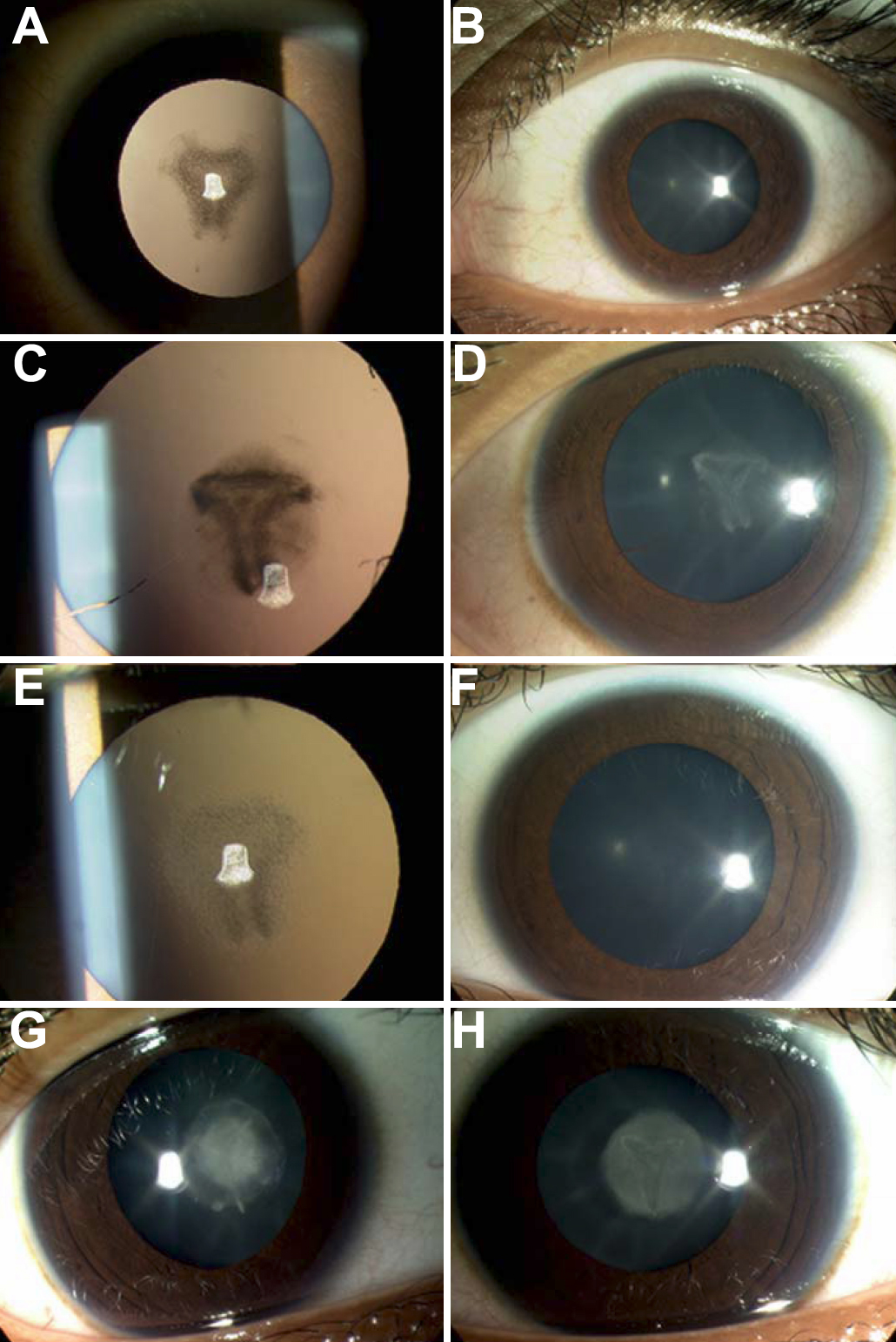 Figure 1. Cataract phenotype of family. A: Left eye retroillumination view and B: left eye slitlamp view of patient II:3. C: Left eye retroillumination view and D: left eye slit lamp view of patient II:5. E: Left eye retroillumination view and F: left eye slit lamp view of patient II:6. G: Right eye slit lamp view and H: left eye slit lamp view of patient II:4.