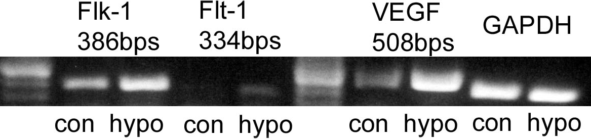 collected immediately after treatment. Image shows RT-PCR analysis for VEGF, FLK-1, and Flt-1. GAPDH was detected as an internal control. Representative image of three experiments is shown.