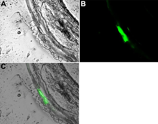 of EGFP as detailed in Methods. A: Differential interference contrast (DIC) picture of transgenic mouse conjunctiva. B: Frozen section of conjunctival tissue with EGFP expression in the same section. C: Merged picture of A and B.