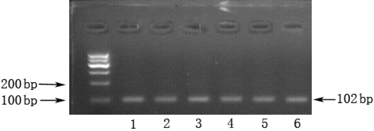 a 1.5% Tris–acetate–EDTA agarose gel, and an expected product at 102 bp