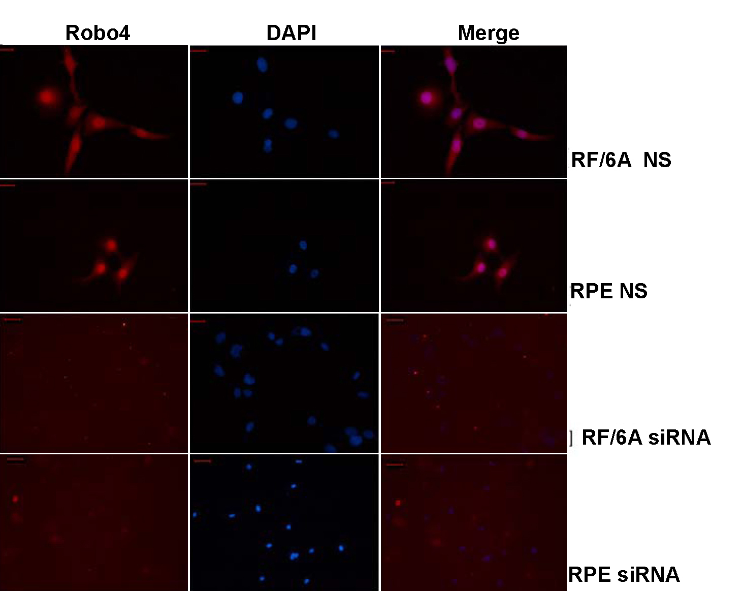 in both cell lines, was very strong in NS siRNA-treated cells but was barely detectable in the Robo4-siRNA-treated cells. Abbreviations: control siRNA treated cells (NS); Robo4 siRNA-treated RF/6A cells (RF/6A siRNA); Robo4 siRNA-treated RPE cells (RPE siRNA). Bar denote 50 μm.