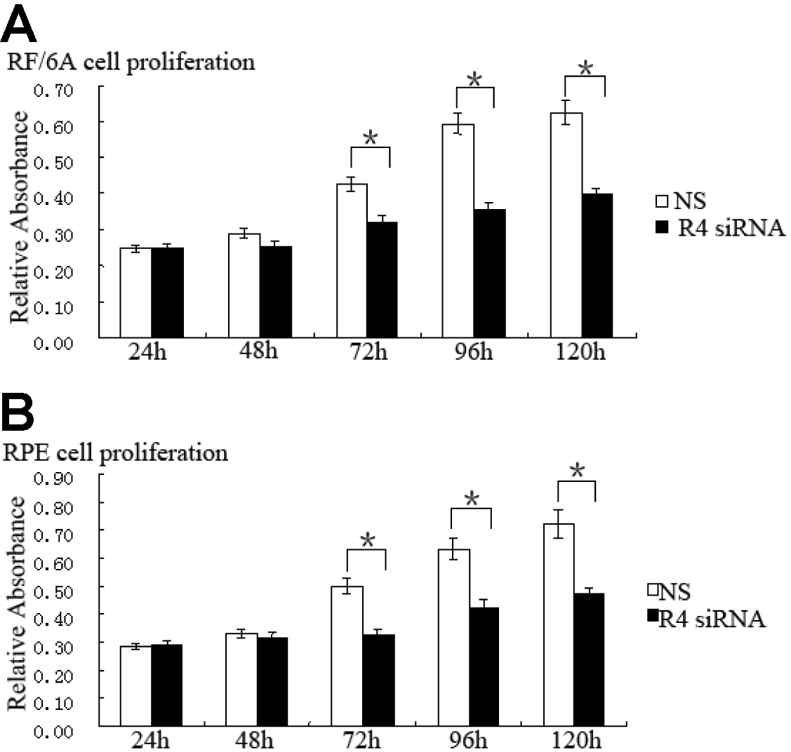 Figure 7. Effect of Robo4 on the proliferation of RF/6A and human RPE cells. RF/6A (A) and RPE (B) cell proliferation was measured with an MTT assay at 24 h, 48 h, 72 h, 96 h, and 120 h. Values are the means±SD of at least