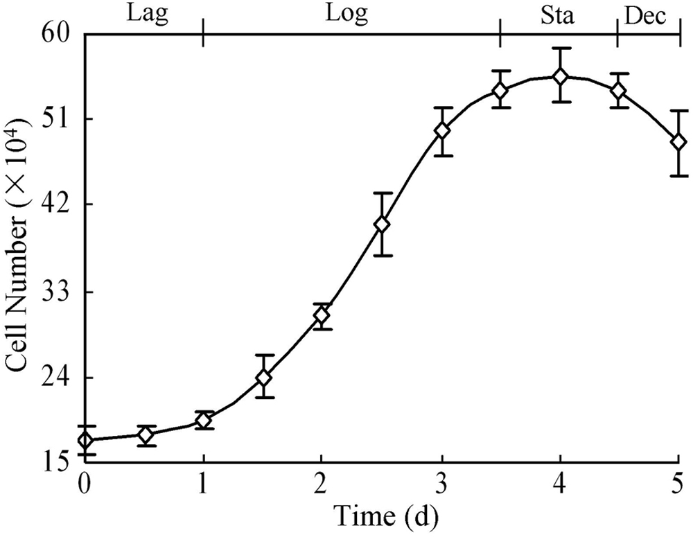 The growth curve of NRCE cells at passage 191. The lag phase (Lag), logarithmic phase (Log), stationary phase (Sta), and decline phase (Dec) were shown.