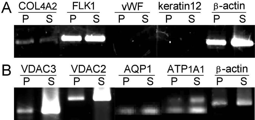 Figure 4. Gene expression of marker proteins and membrane transport proteins in NRCE cells. A: Gene expression of marker proteins. NRCE cells stably express collagen type IV α2 chain (COL4A2) and vascular endothelial growth factor receptor 2 (FLK1), but not von Willebrand factor (vWF) or keratin 12. B: Gene expression of membrane transport proteins. NRCE cells express voltage-dependent anion channel 3 (VDAC3), voltage-dependent anion channel 2 (VDAC2), aquaporin 1 (AQP1), and Na+-K+ ATPase alpha 1 subunit (ATP1A1). P, NRCE cells in primary culture; S, NRCE cells at passage 191. β-actin was used as a loading control.