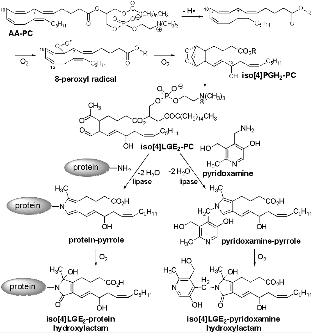Schematic representation of isolevuglandins (isoLGs) generated by free radical-induced oxidation of arachidonates. Arachidonates such as AA-PC are efficiently trapped by pyridoxamine, preventing their adduction to proteins.
