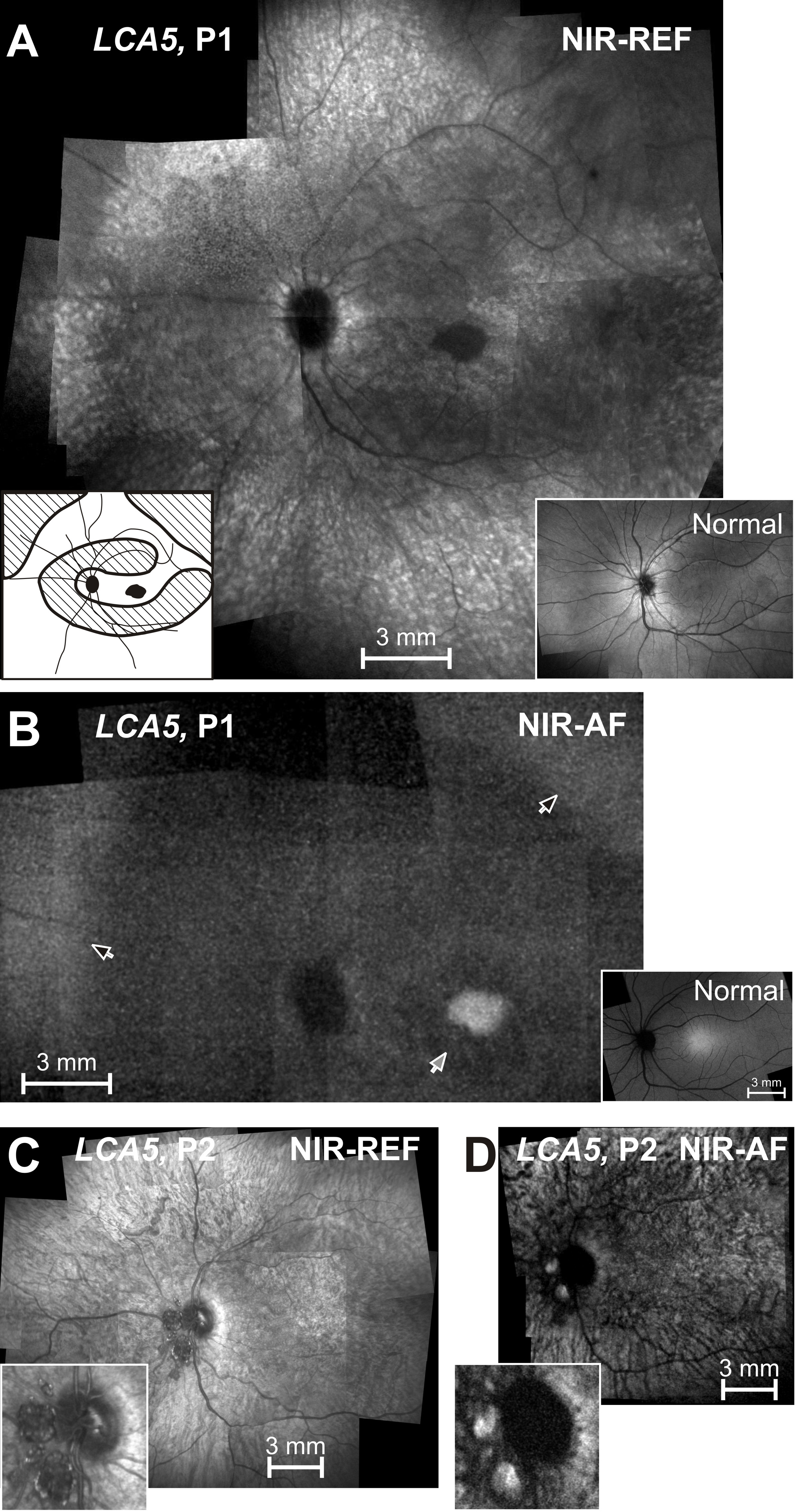 reflectance and autofluorescence images of the LCA5 patients. A: