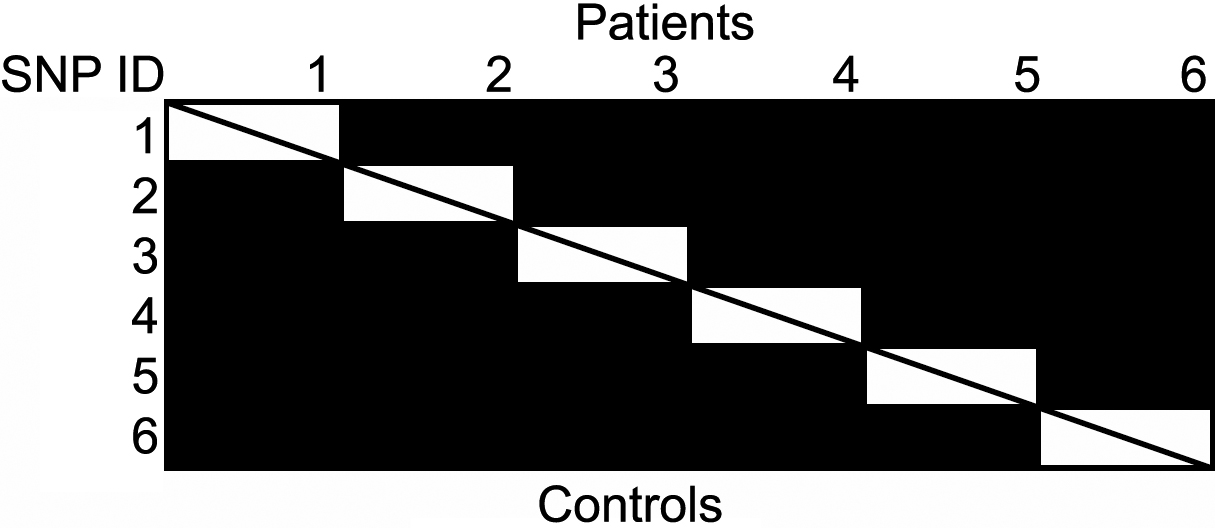 Figure 2. D' score for the six SNPs studied across the PTPN22 haplotype. Black cells indicate that D' is greater than 0.9. Upper: patient population, lower: control population. The figure
