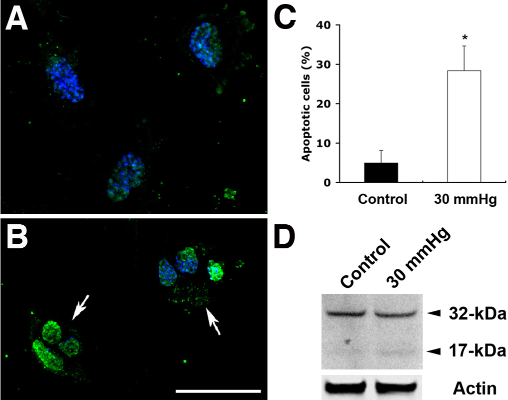 hydrostatic pressure (30 mmHg) for 3 days. Non-pressurized control cells show normal nuclei (A). However, the apoptotic phenotype of nuclei in RGC-5 cells exposed to elevated hydrostatic pressure was observed (arrows;