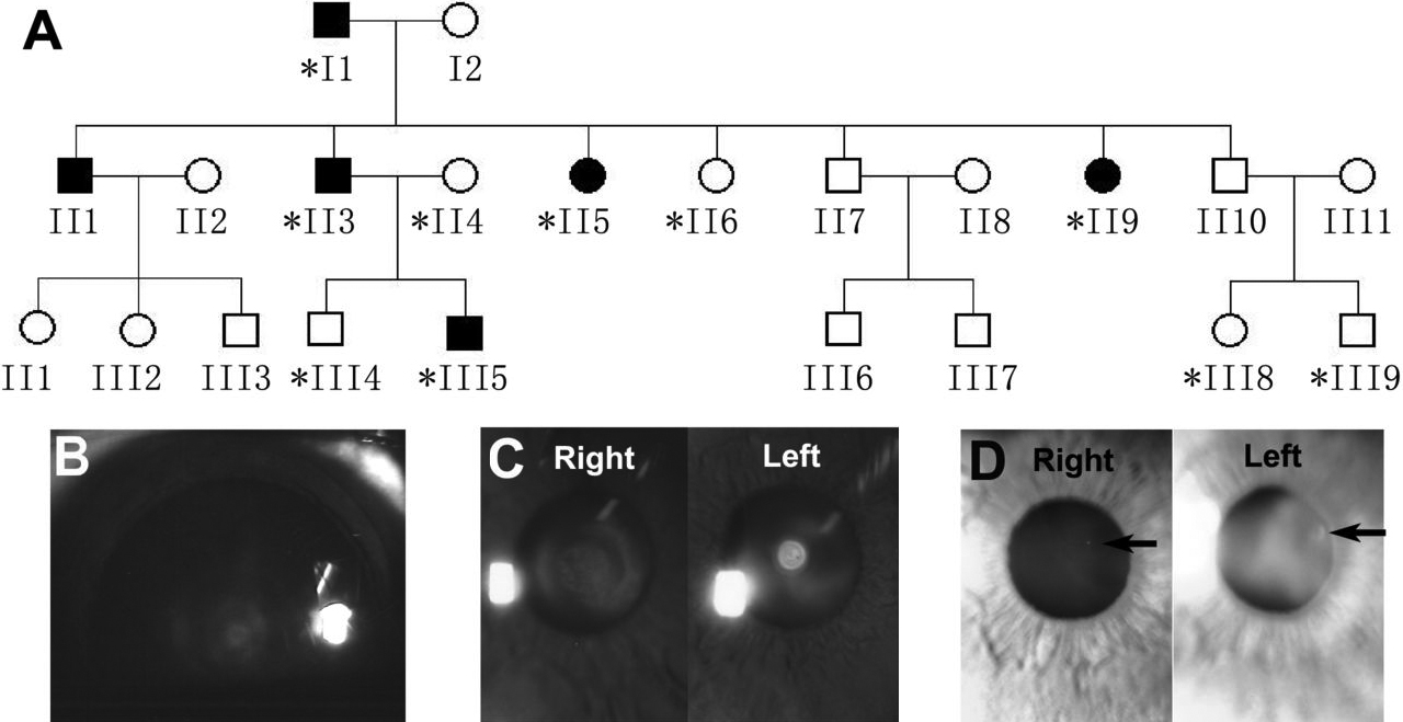 Figure 1. A Chinese autosomal dominant cataract family. A: Pedigree of a three-generation Chinese family with autosomal dominant cataract is shown. The asterisk indicates the family