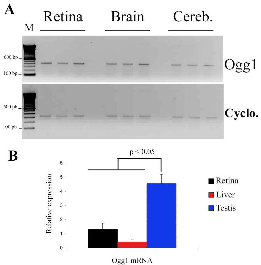 using specific primers for mouse Ogg1 mRNA and cyclophilin A mRNA (Cyclo). Cyclo mRNA was used as an internal control. The 400 bp band corresponds to Ogg1 PCR products and the 311 bp band corresponds to cyclophilin A PCR products. B represents comparison of the Ogg1 mRNA expression in neuroretina, liver, and testis. Quantitative RT–PCR was performed to determine the relative levels of