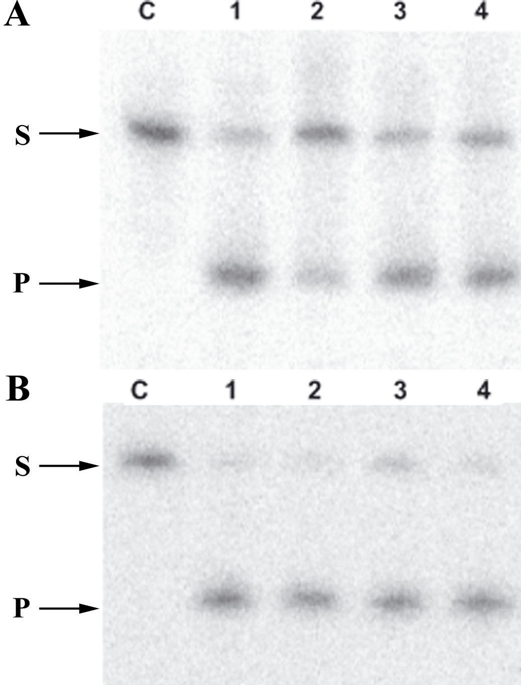 oligonucleotide substrate containing 8-oxoG: C (A) and an abasic site analog (B). Lane C corresponds to experiments omitting protein extract used as negative control. Lanes 1 to 4 correspond to enzymatic