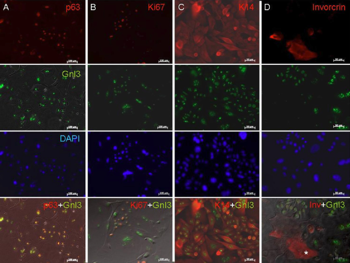 with nucleostemin expression, but some cell showed K14 positive but nucleostemin negative. (indicated by the asteriak) Involucrin