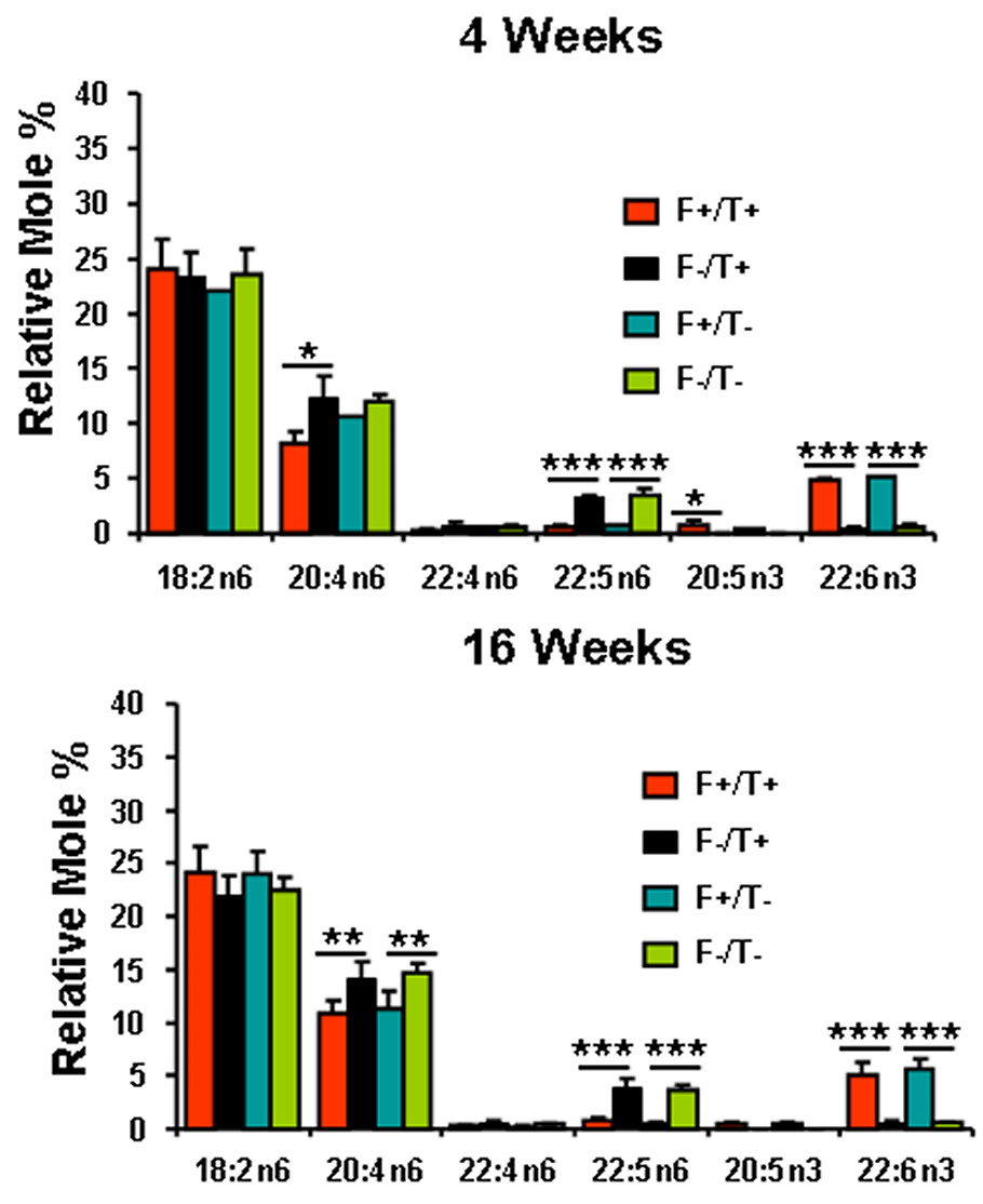 are from total phospholipids of plasma of Fat1+/TG2+, Fat1–/TG2+,