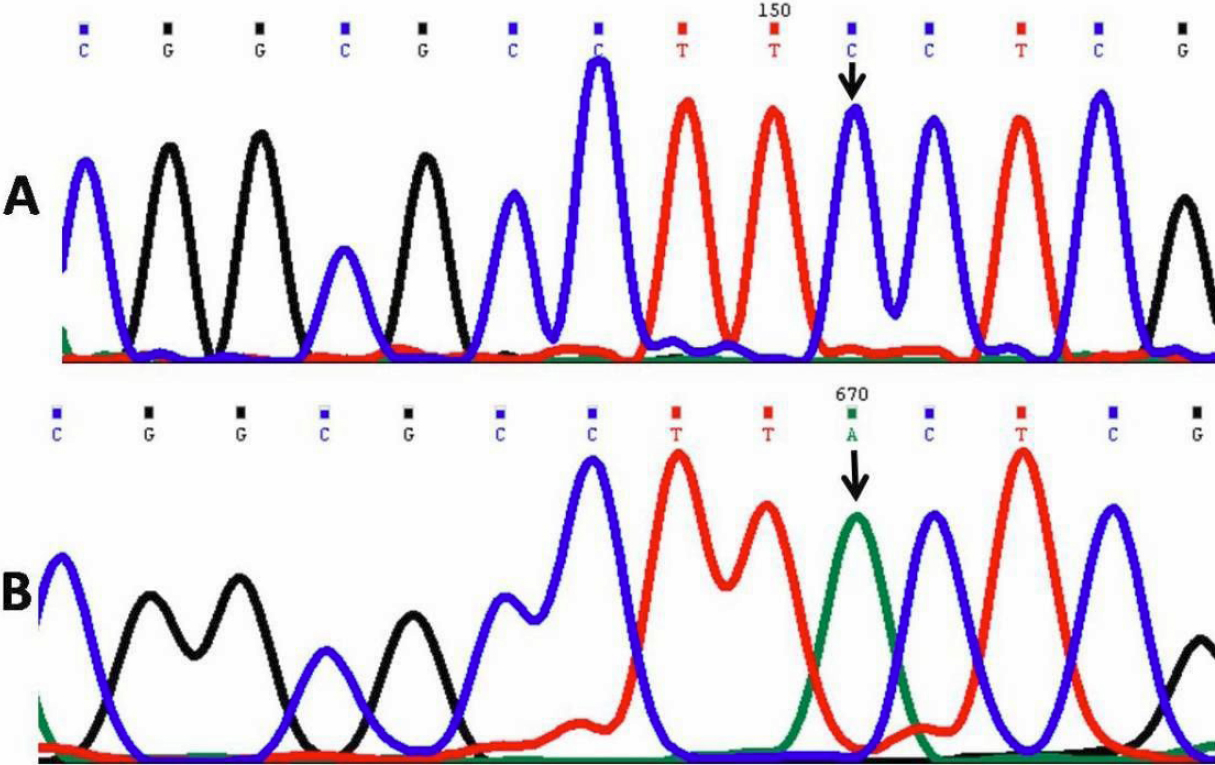 Figure 3. DNA sequence from exon 2 of CYP1B1 equivalent to codon 187-191. A: The reference sequence derived from control is shown. B: The sequence derived from PCG 042 shows the homozygous C>A mutation at genomic position 38155466, which predicts a codon