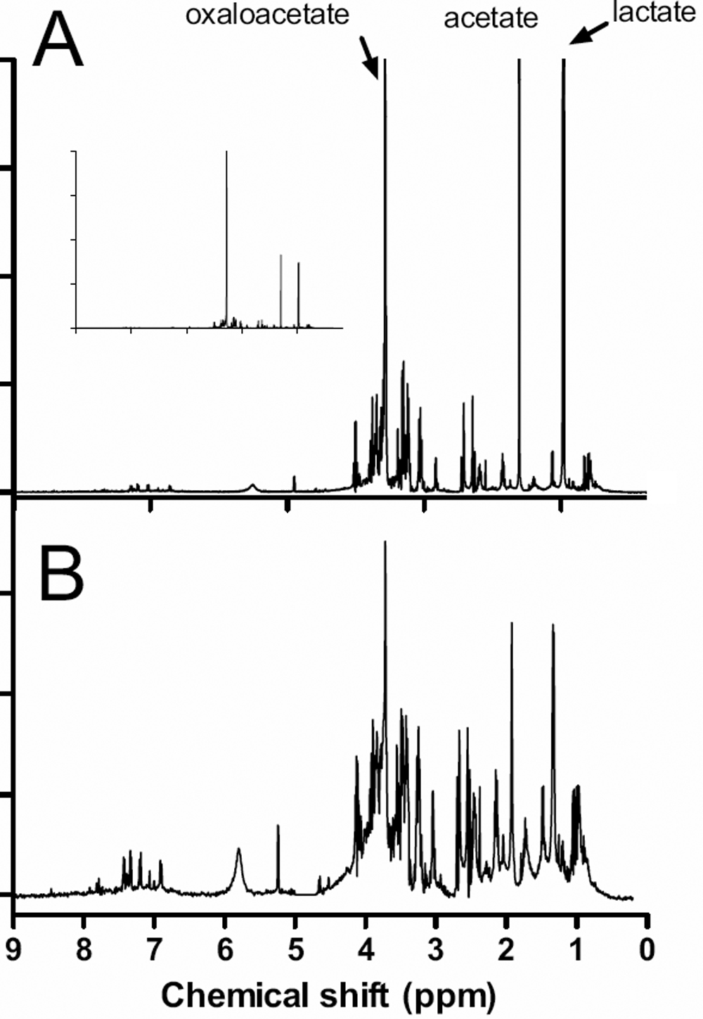 Figure 1. A typical 1D 1H NMR spectrum of vitreous eye fluid from a uveitis patient. A: The original spectrum labeled to show the regions in which some typical biofluid components are known to give rise to resonances.