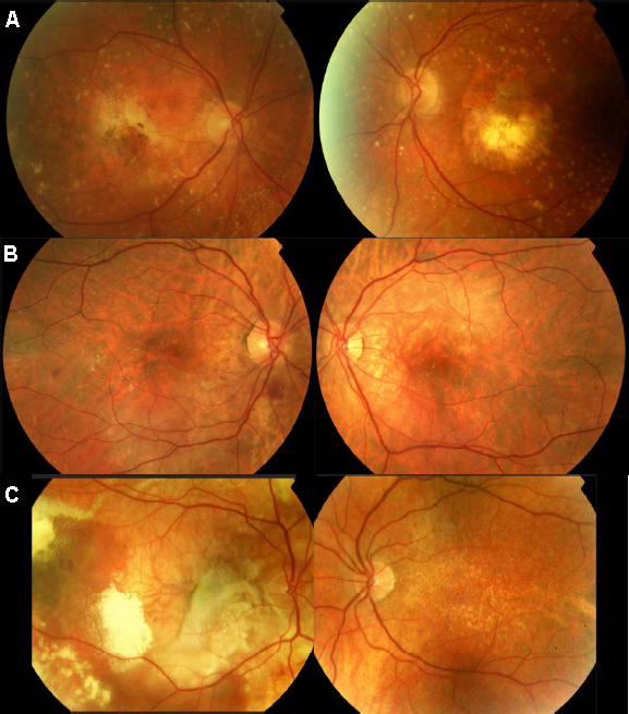 Figure 3. Color fundus photographs of the three affected individuals. All three affected individuals demonstrated the presence of yellow