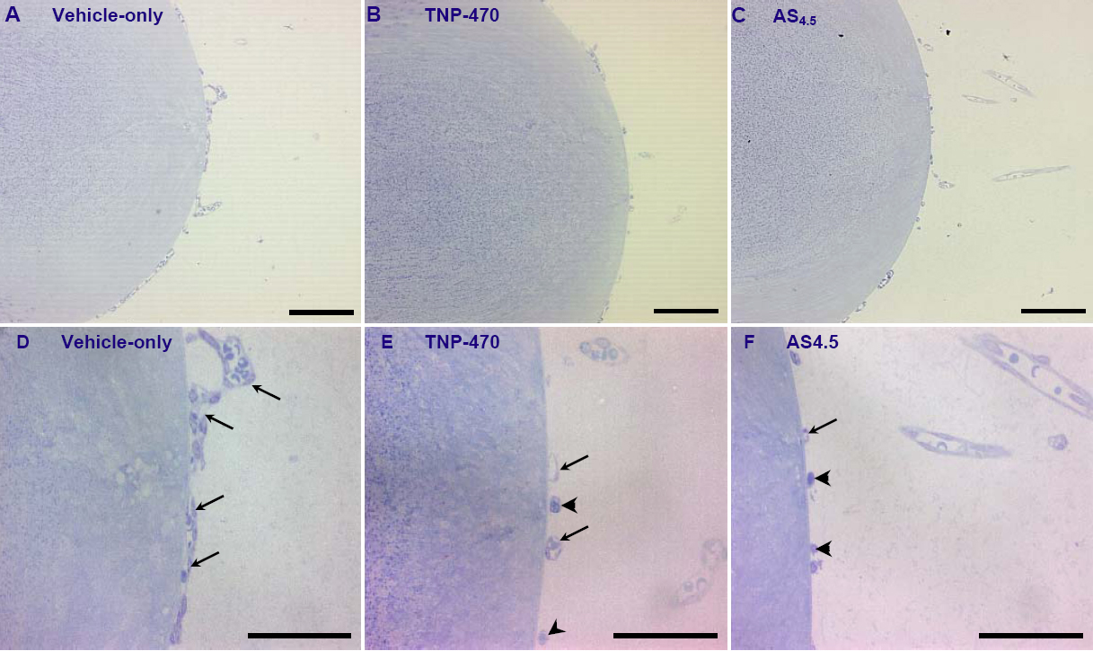 with either vehicle-only (control: A,D), TNP-470 (B,E), or AS4.5 (C,F). In high power light micrographs (D-F), the hyaloid vessels are clearly visible on the lens surface (arrows) in addition to hyalocytes (arrowheads). Scale bars