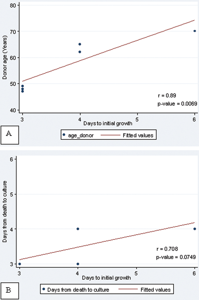 grew faster than cells from older donors (p=0.0069). B: Correlation graph between the time from death to culture versus time to initial growth. The shorter the time from death