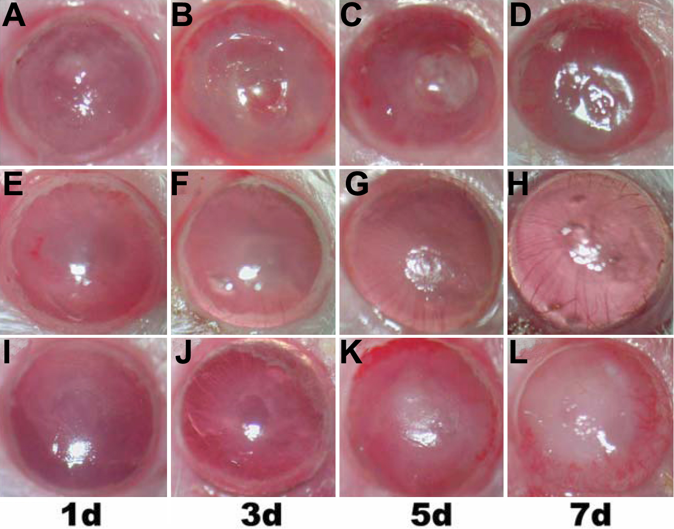 the corneal lesion was reduced at all time points. The images in the third row (I, J, K, and L) show the disease process at one, three, five, and seven days, respectively, post-infection in the IL-1β treated group. The
