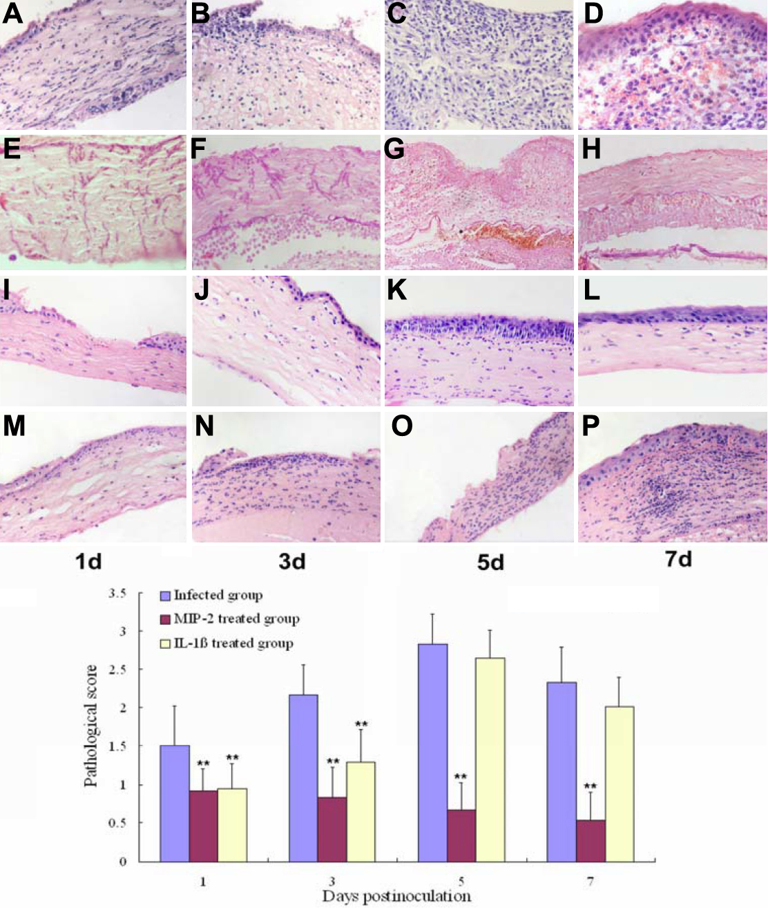 at all time points (magnification 400X). M, N, O, and P represent the inflammatory changes in the IL-1β treated group. The inflammatory responses were significantly reduced on days