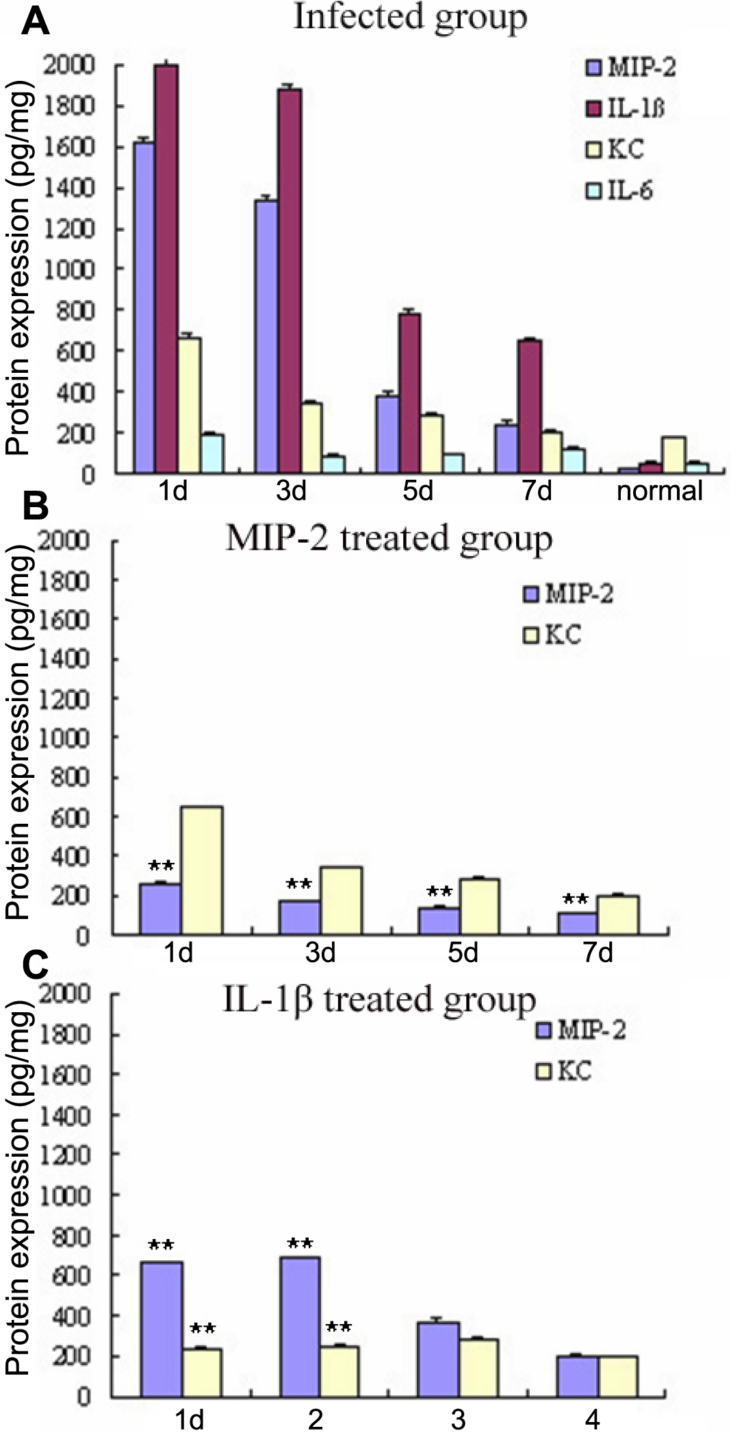 lower compared to the infected group. C shows protein expression levels of MIP-2 and KC in the IL-1β treated group. This bar chart illustrates that the protein expression