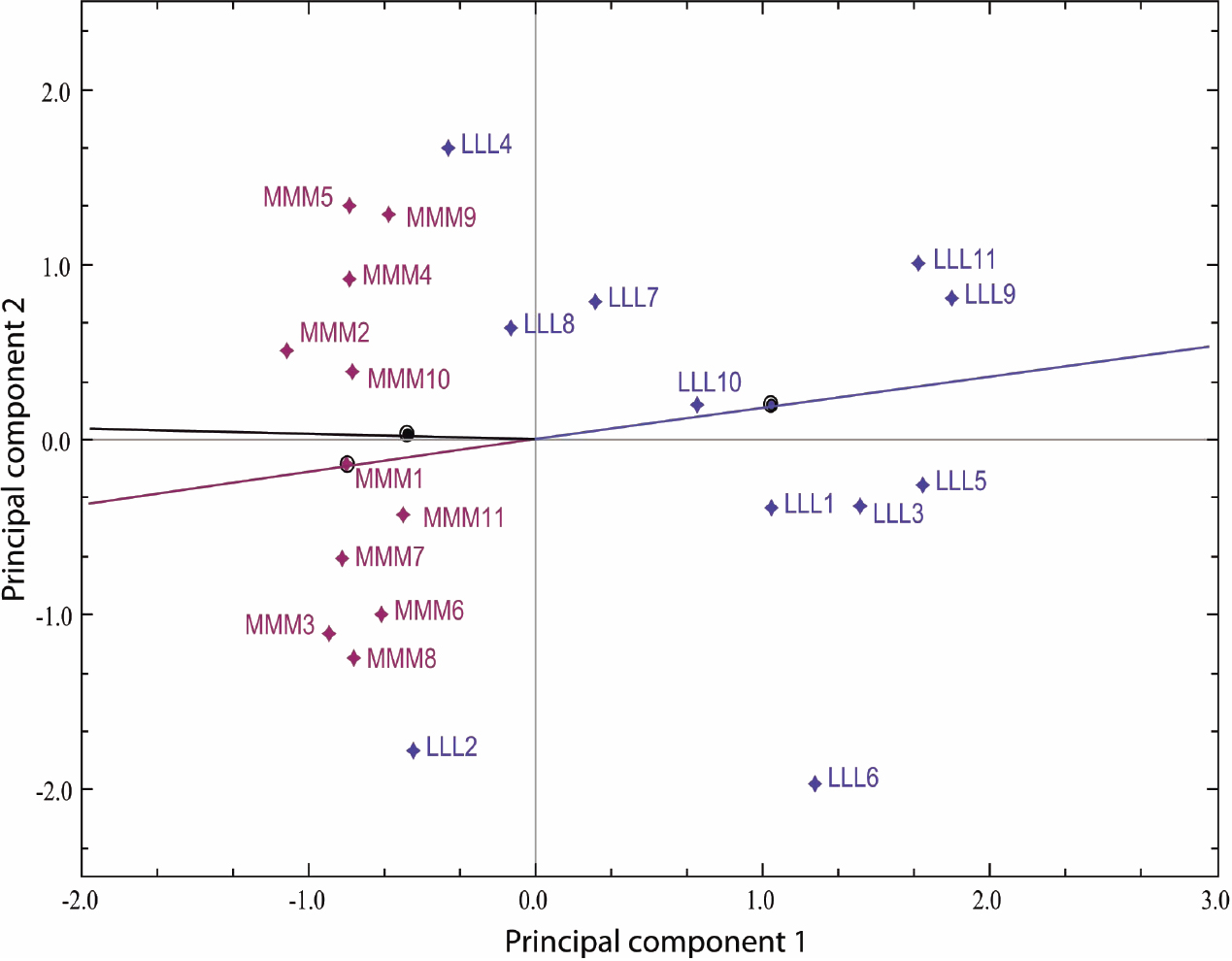 the point of origin through the respective group medians, which are marked by an equally colored dot. The total variance retained