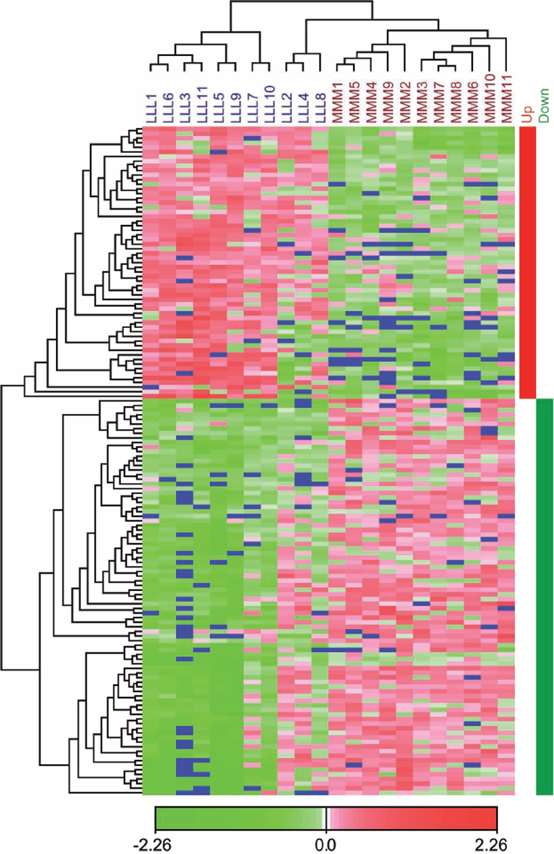 Figure 4. Hierarchical clustering of samples and transcripts. The samples are arranged in columns, and the transcripts are arranged