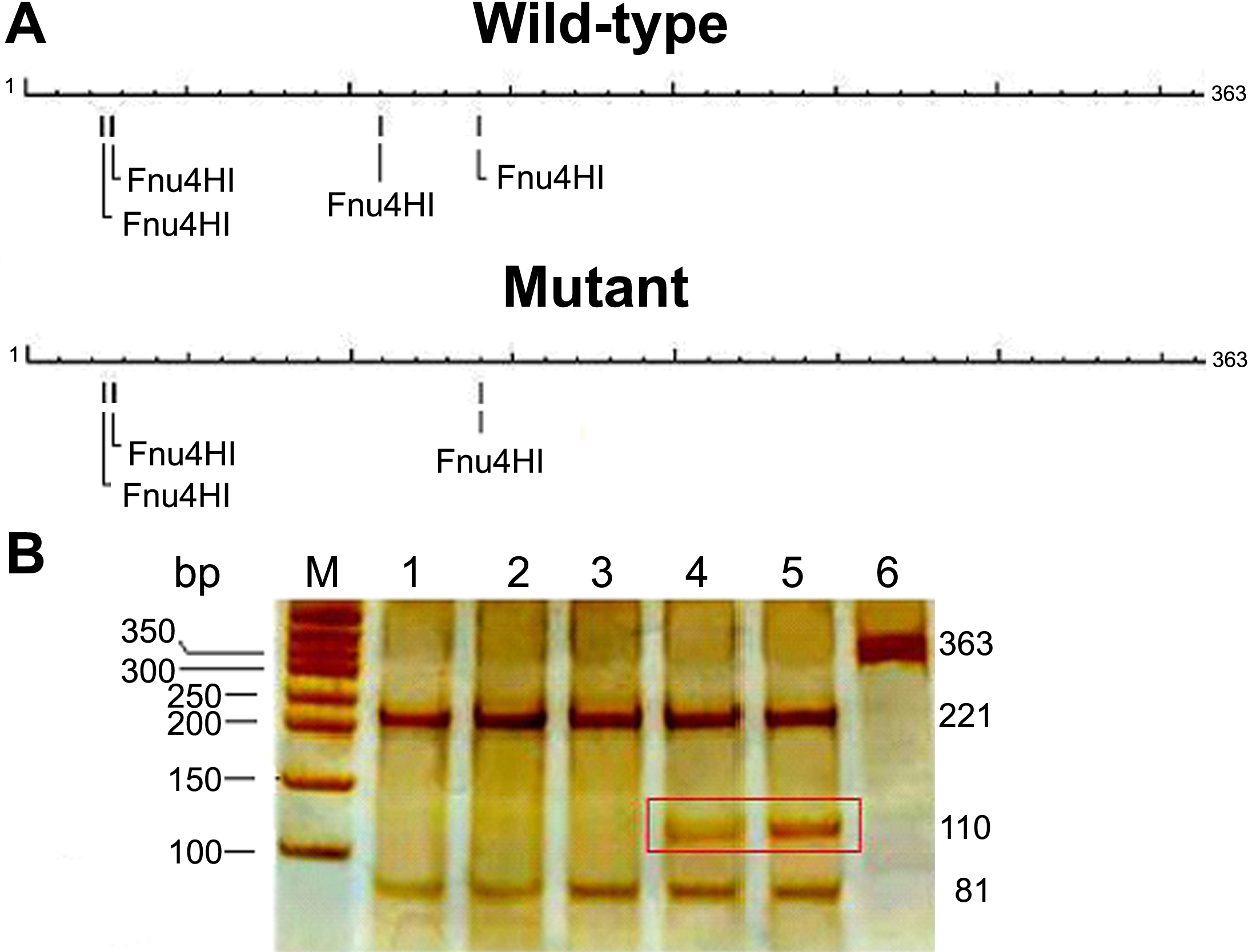 PCR-RFLP method. The positions of the Fnu4HI restriction sites (GC/NGC)