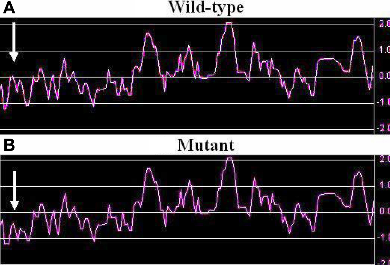 the hydropathy value in a default window size of 7. It was obvious that the mutant form showed lower hydrophilicity in the