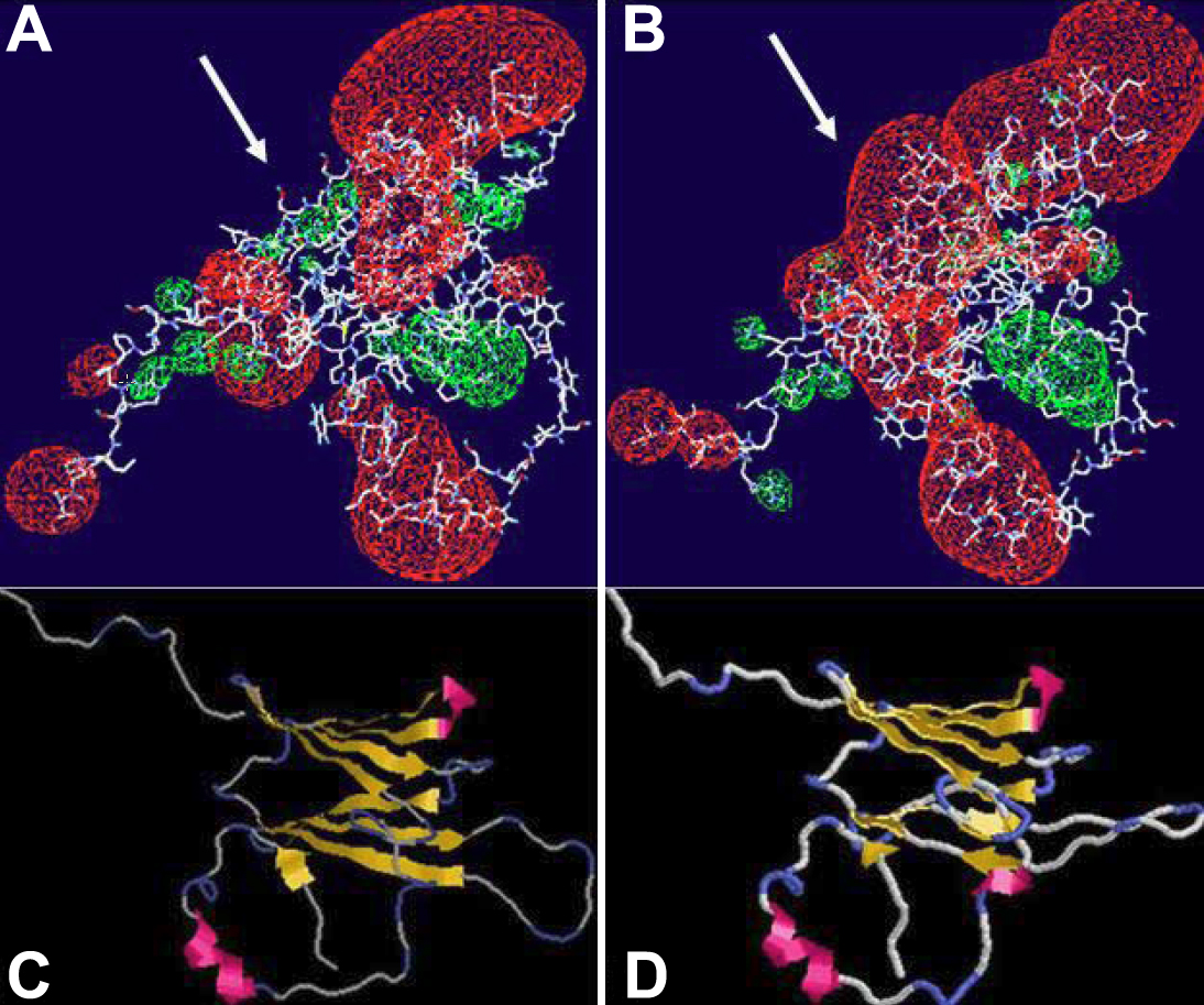potential) clouds. The alteration from a positive in the wild-type (A) to a negative potential in the mutant form (B) is indicated by the white arrows. Protein models of wild-type αB-crystallin (C) and its mutant form (D) are displayed. The antiparallel β sheets are yellow and the α helices are red. The blue sections are the looping regions.