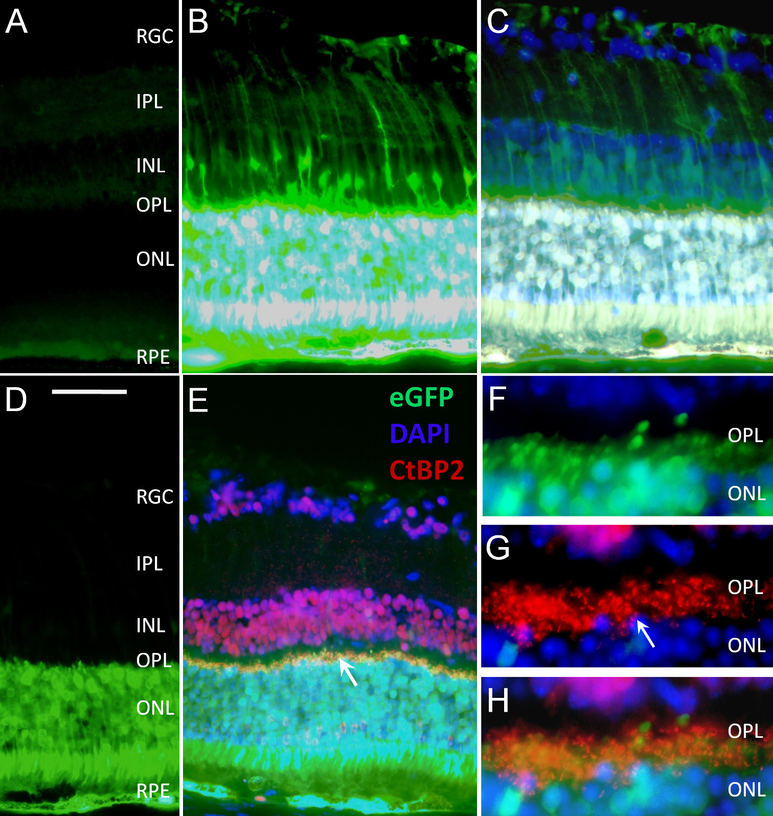 portion of the OPL, colocalization of eGFP expression and CtBP2